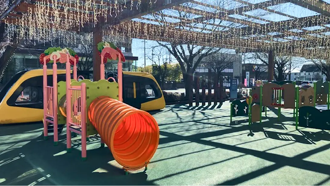 LRTをモデルにした遊具、イチゴのすべり台などが充実した楽しめるエリアです。